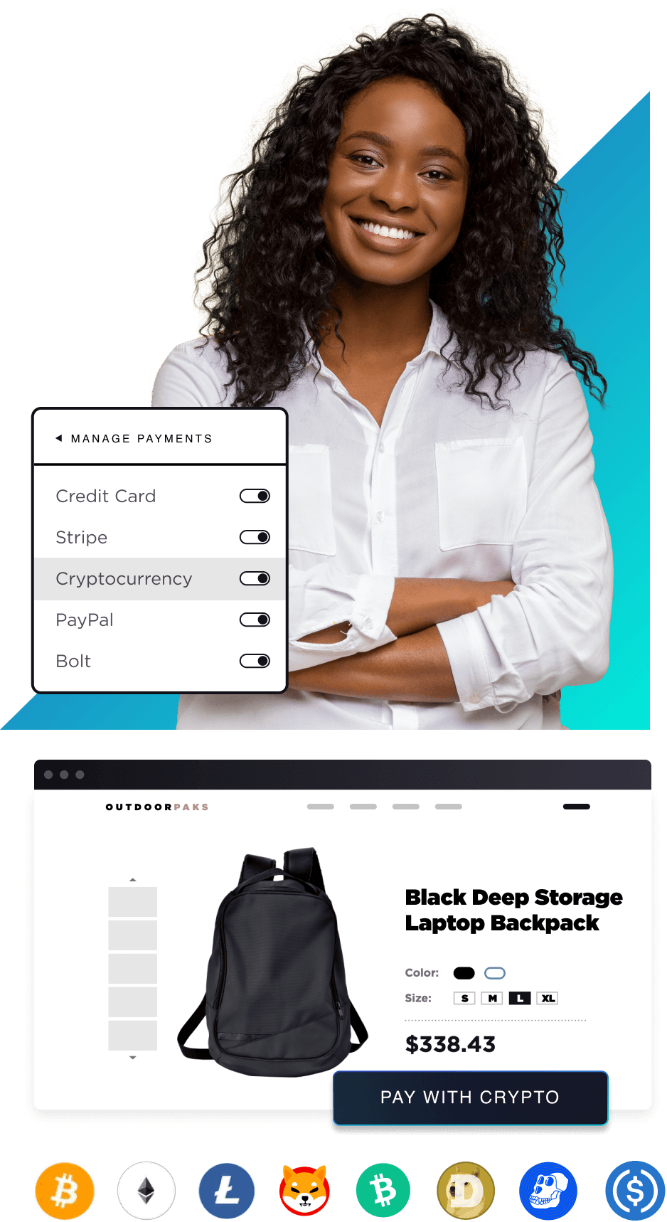 Crypto adoption won’t affect traditional payment offerings — with blockchain technology, crypto payments can seamlessly integrate within your website and with other payment options.