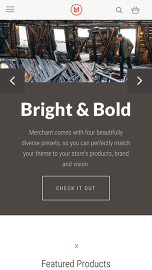 Merchant is a versatile, scalable theme that will grow with your store. Its clean design and four stylish presets provide a space for your products to shine. Ideally suited to catalogs large and small, Merchant is easy to set up, a pleasure to browse, and designed to get your customers to the checkout.