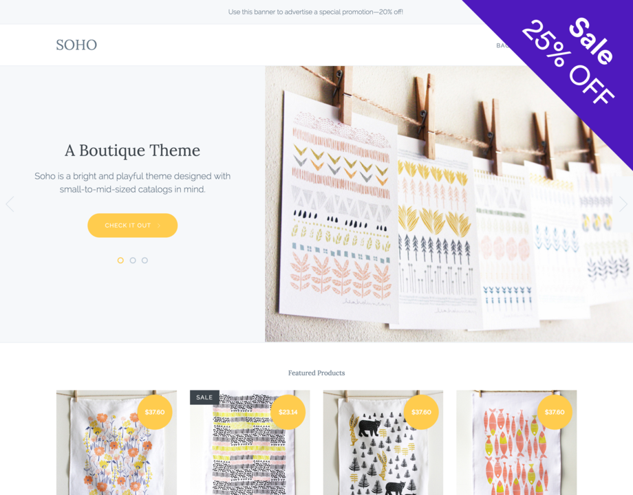 Soho is a bright and playful theme designed with artisans and small businesses in mind. Ample white space and clean typography let you show off your products in style. Colorful buttons and sales-ready calls to action invite customers to engage with your brand and get to the checkout—fast.