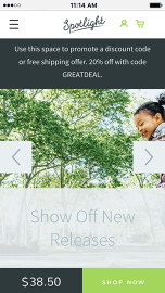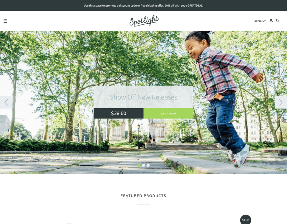Spotlight is a bold and engaging theme designed to feature your top products and promotions. Its homepage combines stunning, full-width imagery with prominent promotion boxes, customer reviews and quick-add-to-cart functionality. Easily customizable, Spotlight puts the focus on what matters most—driving sales.