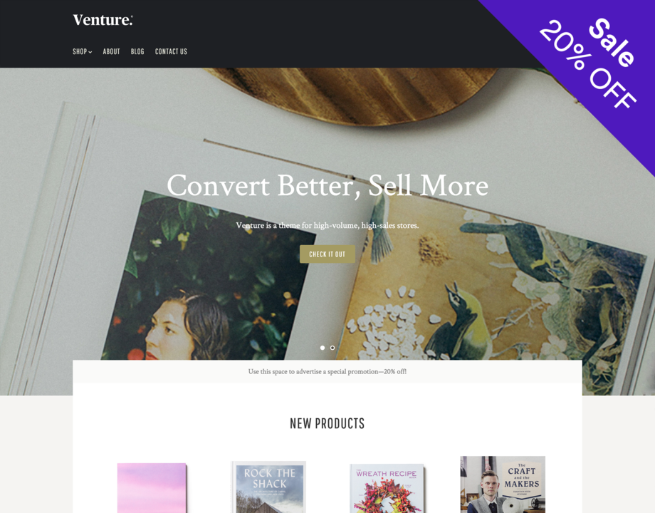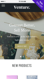 Venture is a theme for fast-growing online stores. It's ultra-powerful, versatile, and easily supports large catalogs with a wide range of products. In-depth filtering and prominent product reviews lend your store an enterprise feel, while Venture's modern design remains stylish and sophisticated.